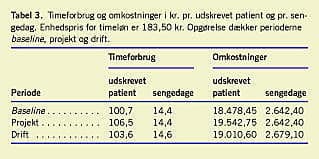 Resultater: Lønomkostninger pr. udskrevet patient er 18.487 kr. og 19.010 kr. hhv. før og efter gennemførelse af projektet. Omkostningerne pr. sengedag er hhv. 2.642 kr. og 2.679 kr. Medicinomkostninger pr. udskrevet patient er 198 kr. før og 148 kr. efter, mens de pr. sengedag er 28 kr. før og 21 kr. efter.