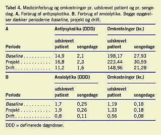 Medicinforbrug og omkostninger pr. udskrevet patient og pr. sengedag for de aktuelle perioder fremgår af Tabel 4 . Omkostninger i forbindelse med både antipsykotika og anxiolytika er faldet fra baseline- perioden til driftsperioden. Antipsykotika er faldet henholdsvis 49,21 kr. og 6,65 kr. pr. udskrevet patient og pr. sengedag, hvilket svarer til et prisfald på 25% for begge opgørelser. Hvad angår anxiolytika udgør prisfaldet over 50%.