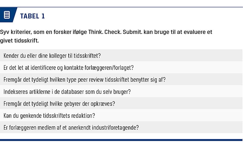 Think. Check. Submit. er resultatet af et samarbejde mellem en lang række aktører inden for videnskabelig publicering. Der findes desuden et tilsvarende initiativ til konferencer. Kernen i dette initiativ er syv kriterier, som en forsker kan bruge til at evaluere et givent tidsskrift med. Disse syv kriterier udgør blot et ud af mange initiativer, der skal understøtte forskeres analyse af tidsskrifter mhp. at identificere de tvivlsomme. Der findes ganske mange forskellige sæt kriterier til analyse af tidsskrifter, og de spænder fra ganske få kriterier til en meget lang række kriterier [29]. I nogle af disse sæt kriterier lægges der vægt på stavefejl, layout og lignende. Det anbefales dog, at man i evalueringen lægger vægt på indhold, ikke form [30] (Tabel 1).