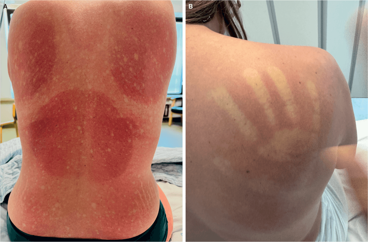 En 38-årig kvinde blev indlagt efter fire dages feber, muskel- og ledømhed, hals-, ryg- og retrobulbære smerter samt almen påvirkning. Symptomerne debutede to dage inden hjemkomst fra en tidages rejse til Bali. Fem døgn efter debut af ovenstående symptomer udviklede patienten et diffust, erytematøst, konfluerende udslæt på store dele af truncus (A), glutealt og på alle ekstremiteter. Objektivt sås ved tryk tydelig afgrænsning af håndaftrykket på huden (B). Der var små, runde, udsparede elementer, som kaldes »white islands in a sea of red«. Senere udvikledes der petekkielle elementer og ekkymoser på truncus og omkring anklerne. Biokemi: trombocytopeni (46 × 10⁹/l), leukopeni (1,65 × 10⁹/l) og forhøjede koncentrationer af alaninaminotransferase (252 U/l) og laktatdehydrogenase (648 U/L). Serologisk undersøgelse: positiv dengueantigen- og antistof og positiv PCR.