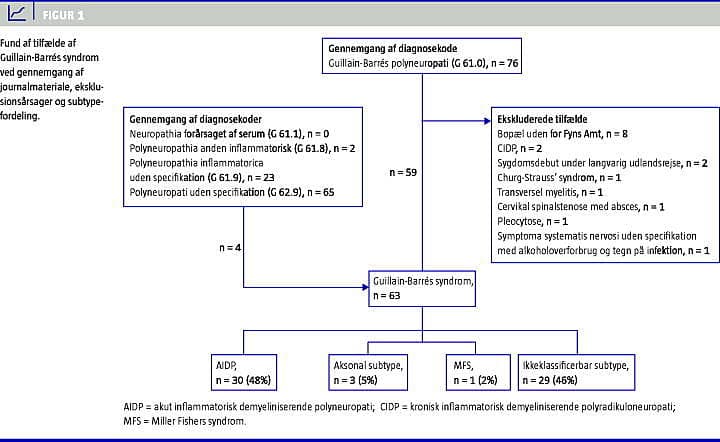 Ved gennemgang af journalmateriale verificeredes 63 tilfælde af GBS. Øvrige tilfælde blev ekskluderet af forskellige årsager (Figur 1 ). Ved gennemgang af nærliggende diagnosekoder blev der fundet fire falsk negative tilfælde af GBS.