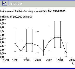 RESULTATER: Incidensen var 1,57 pr. 100.000 personår for 1996-2000 og 1,73 pr. 100.000 personår for 2001-2005. Stigningen af incidensen var 0,17 pr. 100.000 personår (95% konfidensinterval (KI): -0,65-0,98). Incidensen for hele perioden var 1,65 pr. 100.000 personår. I alt 56% af patienterne med GBS angav en forudgående infektion fordelt som luftvejsinfektion (25%), gastroenteritis (21%) og influenzalignede symptomer (10%). Der var ingen signifikant forskel i rapporterede forudgående hændelser mellem 1996-2000 og 2001-2005 (p = 0,47).