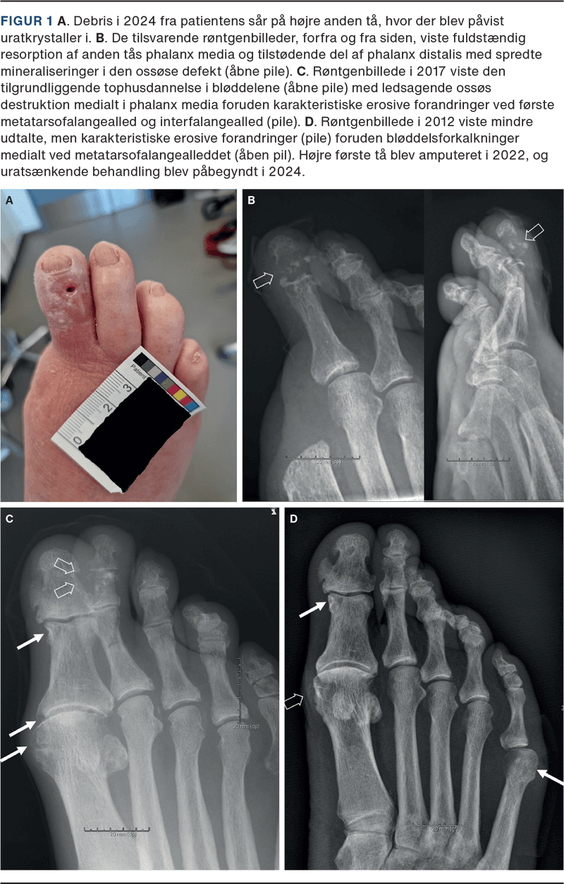 En 88-årig mand med DM2, hypertension, hyperkolesterolæmi, nedsat nyrefunktion og atrieflimren, og som var ikkeryger og uden alkoholoverforbrug, blev i 2005 undersøgt af neurolog pga. stikkende smerter under fødderne, men der var ingen tegn på neuropati. Patienten blev udredt i 2019 hos reumatolog pga. smerter i fødder, men uratsænkende behandling blev ikke iværksat. P-urat var i hele perioden 0,44-0,55 mmol/l. I 2012 havde han haft et forløb i diabetesambulatorium pga. sår over højre femte metatarsofalangeal (MTP)-led, som blev behandlet med sårpleje og langvarig antibiotikakur indtil opheling. Patienten var hos fodkirurg i 2017 med sår på højre anden tå, hvorfra der blev udtømt »tophusmateriale«. I 2022 opstod et nyt sår på højre første MTP-led, som blev behandlet med amputation af første tå. Der blev beskrevet »en del tophusmateriale« under operationen. Gentagne røntgenundersøgelser af fødderne viste fra 2012 tiltagende erosioner foreneligt med AU, men fortolket som infektion (Figur 1).