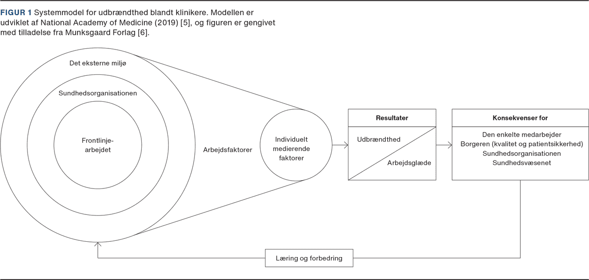 Formålet med denne statusartikel er at introducere en systemmodel, der beskriver årsager til udbrændthed samt konsekvenserne for personale, patienter (kvalitet og patientsikkerhed), sundhedsorganisationer og sundhedsvæsenet. Formålet er samtidig at give eksempler på disse årsager og konsekvenser med fokus på dansk kontekst i de tilfælde, hvor dette har kunnet identificeres.