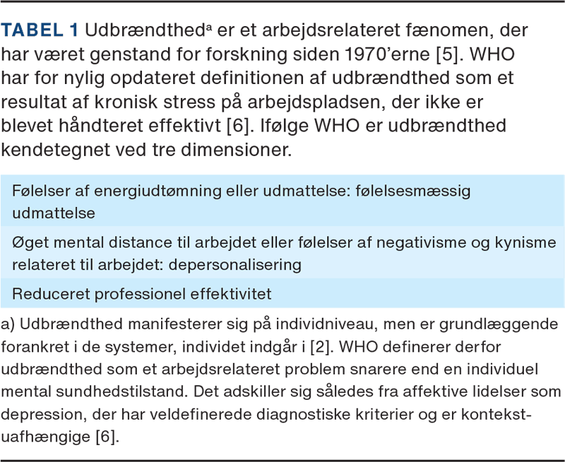 Medarbejdere og faglige organisationer i det danske sundhedsvæsen har i årevis påpeget problemer med stigende arbejdstempo, udbrændthed og personaleflugt [1]. Dette er dog ikke kun et dansk fænomen. I 2022 erklærede den øverst ansvarlige for folkesundheden i USA, Surgeon General of the United States, at udfordringer med udbrændthed hos sundhedspersonalet skulle betragtes som en national krise [2]. Det er således vigtigt at adressere udbrændthed. Det skyldes et ønske om at beskytte personalet, men også fordi forskning viser, at udbrændthed hos personalet medfører en ringere kvalitet af sundhedsydelserne, og således udgør en patientsikkerhedsrisiko [3, 4]. Udbrændthed defineres i Tabel 1.