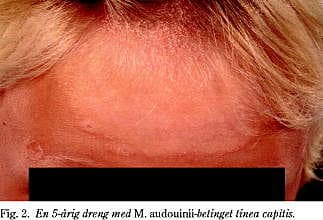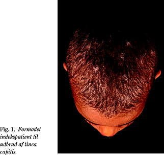 De formodede indekspatienter var et søskendepar af dansk/afrikansk herkomst, formentlig smittet i Tanzania i sommeren 2000. Lidelsen debuterede i efteråret 2000 med kløende hårbundsaffektion. I marts 2001 sås der spredte områder i hårbunden med skældannelse og udtynding af håret (Fig. 1 ) samt grønlig fluorescens i Woods light (langbølget ultraviolet lys). Mikroskopi viste dermatofytter lejret i og uden på de inficerede hår (ektothrix), dyrkning viste M. audouinii . Forud for henvisning til en hospitalsafdeling var børnene blevet behandlet systemisk med terbinafin dagligt gennem ca. 3 mdr. I april 2001 påbegyndte man systemisk behandling med fluconazol, suppleret med lokalbehandling med terbinafin og ketoconazol. Behandlingen havde delvis effekt, men ingen af børnene var helbredt efter 57 ugers behandling (Tabel 1 , patient 1 og 2). Børnene gik i samme børneinstitution.