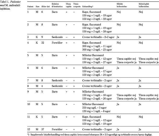Tinea capitis og corporis er de hyppigste svampeinfektioner hos børn. Ætiologien er i Danmark overvejende zoofile dermatofytter (Microsporum [M.] canis fra katte og hunde, Trichophyton [T.] verrucosum fra kalve og T. mentagrophytes fra små gnavere), men gennem de senere år er der set et øget antal antropofile infektioner (hovedvært er mennesket, og smitte sker ved direkte og indirekte kontakt mellem mennesker, fx T. tonsurans , T. violaceum og M. audouinii ). Vi beskriver et udbrud af M. audouinii -betinget tinea capitis i en børneinstitution for at gøre opmærksom på det kliniske billede, den øgede smitterisiko ved antropofil infektion og de behandlingsmæssige problemer ved især Microsporum -infektion.