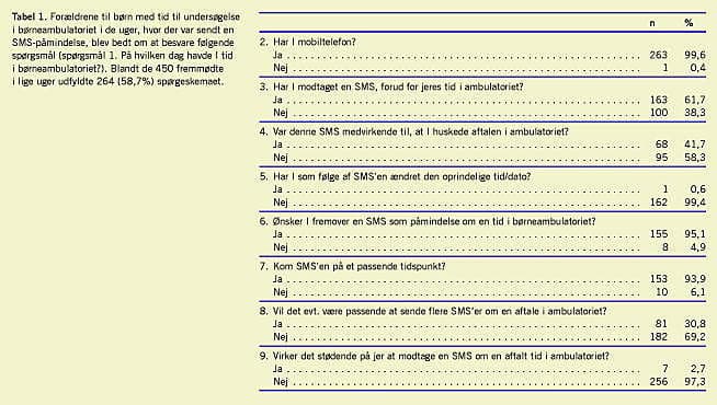 Resultat: I periodens ulige og lige uger udeblev henholdsvis 55 (10,0%) og 28 (5,9%) patienter fra den planlagte undersøgelse i børneambulatoriet. Den relative risiko for at udeblive uden at have fået tilsendt en SMS-påmindelse var 1,7 (95%-konfidensinterval: 1,1-2,7). I alt 68 forældre, svarende til 41,7% af de, som besvarede spørgeskemaet, angav at SMS-påmindelsen var medvirkede til, at de huskede aftalen. Af de adspurgte ønskede 95,1% at modtage en SMS-påmindelse forud for eventuel ny aftale i børneambulatoriet. Blot syv forældre følte sig stødte over den fremsendte SMS-påmindelse.