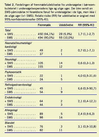 Af Tabel 2 fremgår antallet af udeblivelser i eksponeringsgrupperne ± SMS. I uger, hvor familierne ikke fik/fik en SMS-påmindelse, var der henholdsvis 10,0% og 5,9%, der udeblev: RR 1,7; 95% KI: 1,1-2,7. Vi fandt ingen signifikante forskelle i antallet af udeblivelser imellem grenspecialeambulatorierne (Tabel 2).