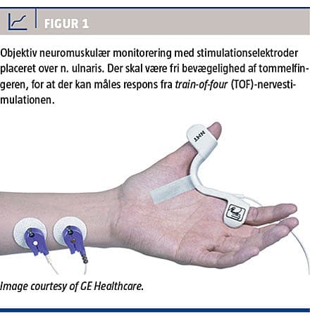 Vha. objektiv neuromuskulær monitorering kan indgift af muskelrelaksantia justeres efter det kirurgiske behov. Oftest måles det muskulære respons fra m. adductor pollicis, når n. ulnaris stimuleres med train-of-four (TOF)-nervestimulation ved håndleddet (Figur 1).