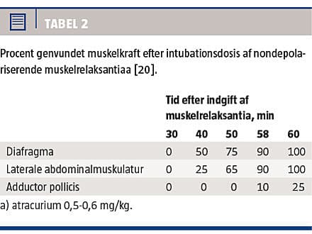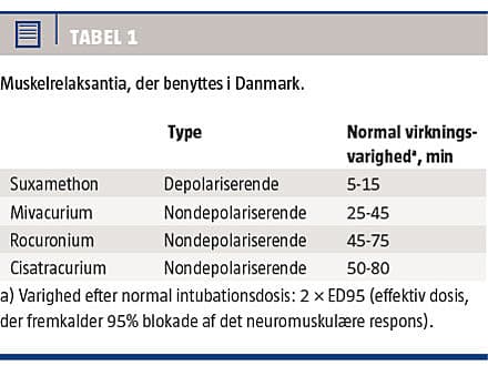 De tilgængelige muskelrelaksantia i Danmark er rocuronium, mivacurium, cisatracurium og suxamethon, og de har stor variabilitet i anslagstid og virkningsvarighed (Tabel 1).