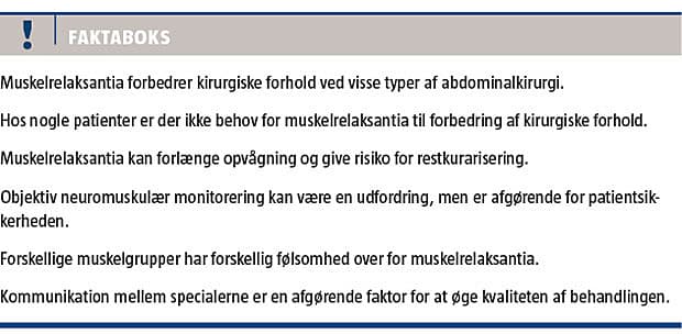 Brug af objektiv neuromuskulær monitorering samt viden om abdominalmuskulaturens følsomhed over for muskelrelaksantia gør det muligt at følge blokadens udvikling og vurdere, om yderligere dosering af muskelrelaksantia vil kunne forbedre de kirurgiske forhold. Imidlertid kan kirurger opleve tilfredsstillende kirurgiske forhold uden brug af muskelrelaksantia [30]. Derfor er det afgørende, at der kommunikeres og samarbejdes på tværs af det anæstesiologiske og det kirurgiske speciale. Det anbefales, at kirurgerne løbende