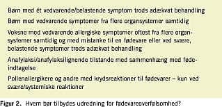 Den dokumenterede prævalens af fødevareoverfølsomhed blandt børn og voksne er mindre end den selvrapporterede, hvilket gør regelret udredning nødvendig for at undgå forkerte og insufficiente diæter. Den IgE-medierede fødevareallergi udløser klassiske, allergiske straksreaktioner fra oro-pharynx, gastrointestinalkanalen, luftvejene og/eller huden, evt. anafylaksi. Det er især mælk, æg, peanut, skaldyr, fisk og nødder, som danskere reagerer på, foruden pollenrelaterede krydsreaktioner. Resultaterne af almindeligt anvendte allergitest med fødevarer skal tolkes omhyggeligt og er ikke diagnostiske. Kun indtagelse af det mistænkte fødeemne i form af kontrolleret fødevareprovokation er den guldstandard, hvorved man kan stille diagnosen og afdække den enkeltes følsomhed med betydning for vurdering af risiko, rådgivning og behandling.