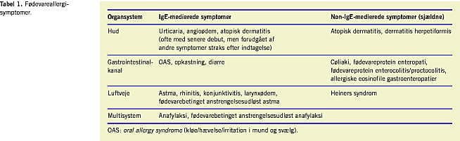 I Tabel 1 er der medtaget symptomer på non-IgE-medieret fødevareallergi, idet de samme organsystemer afficeres.