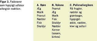 I Figur 3 oplistes de hyppigste allergiud løsende fødevarer blandt danske børn og voksne, foruden de hyppigste pollenkrydsreagerende fødevarer. Allergi over for mælk og æg er oftest midlertidige, mens allergier over for peanut, nødder og fisk persisterer op i voksenalderen. Mens forekomsten af mælkeallergi blandt børn synes mindre hyppig, ses peanutallergi med tiltagende hyppighed i Danmark og beskrives hos ca. 0,4% af danske voksne [13].