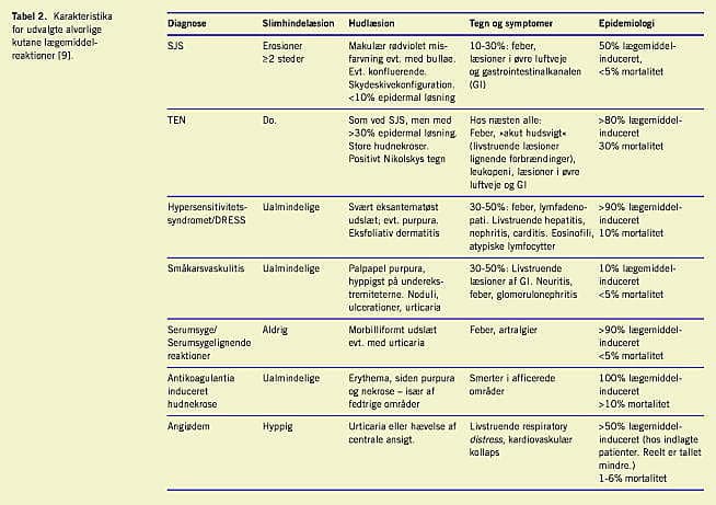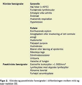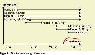 Der spørges til udvikling i den kliniske præsentation (TEN debuterer ofte makulopapuløst) og om evt. lægemiddelseponeringer har medført ændringer i tilstanden. Reaktionstid fra eksposition til første hudmanifestation registreres. CDR's kronologiske forløb plottes ind i toksidermioversigten (Figur 1). Mulige differentialdiagnoser overvejes og undersøges relevant.