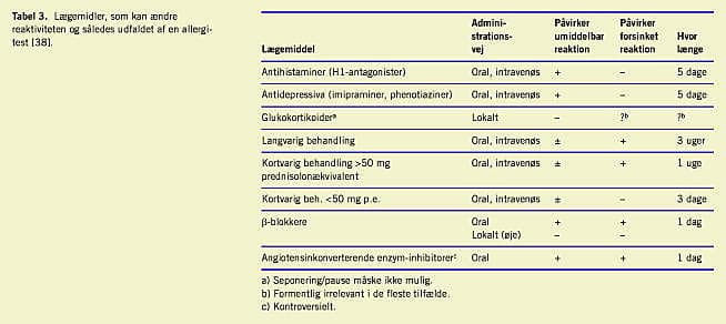 Lappeprøver (type IV) og SPT (type I) udføres 4-12 uger efter reaktion [31] og efter seponering af farmaka, der vides at kunne påvirke hudens reaktivitet (Tabel 3 ).