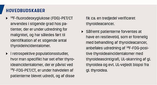 Til trods for en mulig overestimering af malignitetsrisikoen er patienter med 18F-FDG-positive thyroideaincidentalomer i øget risiko for at få thyroideacancer. Klinikeren står over for nye diagnostiske udfordringer. Hvorvidt udredningen af 18F-FDG-positive thyroideaincidentalomer har en betydningsfuld effekt på patienternes prognose og livskvalitet, kan ikke afgøres ud fra den foreliggende litteratur.