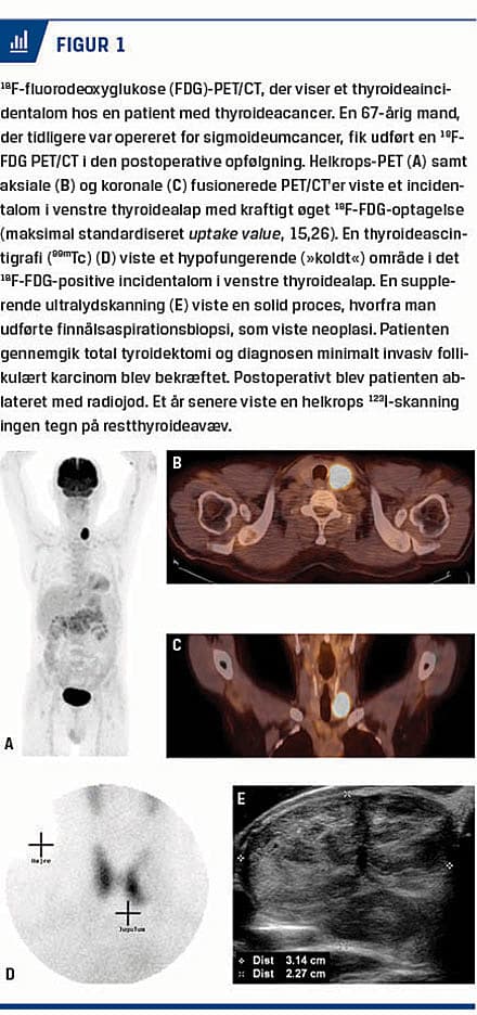 I de seneste år er interessen for thyroideaincidentalomer, som er påvist ved fokal øget optagelse af 18F-fluordeoxyglukose (FDG) i gl. thyroidea på en PET/CT (Figur 1), vokset. FDG er et derivat af glukose og 18F-mærket. FDG anvendes hyppigst som sporstof i PET i udredningen af maligne, infektiøse eller inflammatoriske lidelser. Rationalet for anvendelsen af sporstoffet 18F-FDG er, at malignt væv såvel som infektiøst/inflammatorisk væv har en højere glukosemetabolisme end normalt væv. Graden af 18F-FDG-optagelse i vævet kan kvantificeres, og ved at kombinere PET med en supplerende CT kan den nøjagtige anatomiske lokalisation af pågældende fokus/foci med øget metabolisk aktivitet bestemmes. Disse undersøgelser har ført til identifikation af et stigende antal 18F-FDG-positive thyroideaincidentalomer [3, 4]. I en række retrospektive studier (Tabel 1) om udredning af thyroideaincidentalomer har ca. en tredjedel vist sig at være maligne. Thyroideacancer er den hyppigst forekommende endokrine cancer og har som regel en god prognose [13].