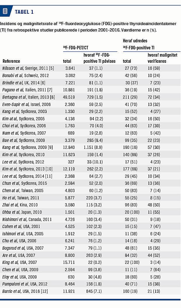I perioden 2001-2016 er der publiceret en række retrospektive studier om udredningen af thyroideaincidentalomer, der er fundet ved 18F-FDG-PET/CT (Tabel 1). Den angivne forekomst af thyroideaincidentalomer er varierende (0,2-10,1%) og i gennemsnit 3,0%. Sammenligning af disse studier er vanskeliggjort af betydelige forskelle i afgørende variable som inklusions- og eksklusionskriterier, populationsstørrelser samt etnicitet og dermed forskelle i prævalensen af thyroideacancer betinget af geografisk og genetisk variation. Litteraturen indbefatter ikke en dansk population, og der findes få studier med patienter, der har samme jodstatus, som befolkningen i Danmark har. Fra Europa findes et svensk studie af Nilsson et al [5], hvor forekomsten af thyroideaincidentalomer er opgjort til 1,1% i