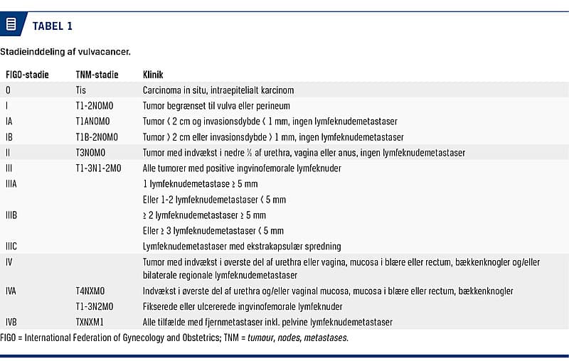 Vulvacancer debuterer oftest i stadium I-II (60%), hvor tumoren er begrænset til vulva (Tabel 1). Lokal spredning sker ved indvækst i vagina, urethra og/eller den anale sfinkter. 20-30% af alle patienter med vulvacancer har ingvinale lymfeknudemetastaser på diagnosetidspunktet. Lymfatisk metastasering afhænger først og fremmest af primærtumorens invasionsdybde, størrelse og lokalisation. Ved en invasionsdybde på ≤ 1 mm og en tumorstørrelse ≤ 2 cm (stadium IA) (Tabel 1) er risikoen for metastasering negligeabel. Ved invasionsdybde > 1 mm og/eller tumorstørrelse > 2 cm vil ca. en tredjedel af patienterne have lymfeknudemetastaser i inguen. Fjernmetastasering til lever eller lunger ses hos under 5%.