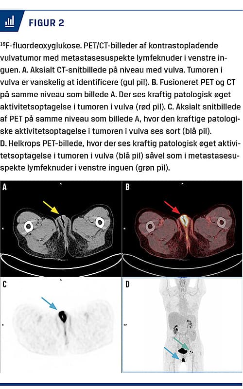 oftest er HPV-induceret for at udelukke samtidig HPV-relateret patologi i cervix. Endvidere foretages der CT, PET-CT og/eller MR-skanning med henblik på vurdering af tumorens udbredelse lokalt i vulva og diagnostik af metastaser, herunder især lymfeknudemetastaser (Figur 2).