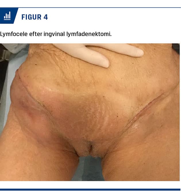 Vulvacancerbehandling kan være behæftet med mange såvel akutte komplikationer som senfølger. De hyppigste akutte komplikationer er sårinfektion, sårruptur og lymfocele (Figur 4), hvor opheling ofte tager flere måneder. Efter ingvinal lymfadenektomi vil ca. halvdelen af patienterne få lymfødem af mons pubis og underekstremiteterne. Tilstanden kan for mange være livsvarig [16, 21]. Resektion i vulva kan medføre seksuel dysfunktion især ved efterfølgende strålebehandling og kan have negativ indflydelse på patienternes livskvalitet [22].