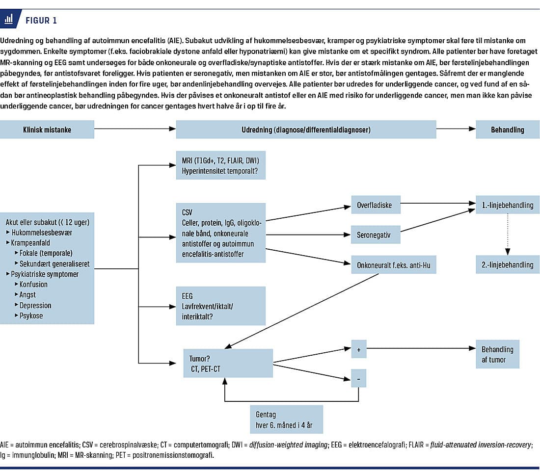 Det bør overvejes at teste for AIE hos patienter med subakut udviklede kombinationer af følgende symptomer og fund, hvor virus og bakterielle neuroinfektioner er udelukket: 1) ændret adfærd og bevidsthed, 2) psykiatriske symptomer, 3) epileptiske anfald eller status epilepticus uden forudgående kendt epilepsi og 4) CSV-inflammation. Der bør hos alle patienter med AIE foretages udredning for okkult cancer i henhold til internationale guidelines [29]. Dette vil ofte indebære CT af thorax, abdomen og bækken og eventuelt helkrops-18F-FDG-PET-CT samt ultralydskanning af bækkenet hos kvinder og testis hos mænd. Ved anti-NMDAR-encefalitis uden fund af ovarieteratom skal undersøgelsen gentages; specielt hos patienter > 14 år bør den gentages hver sjette måned i fire år [29].