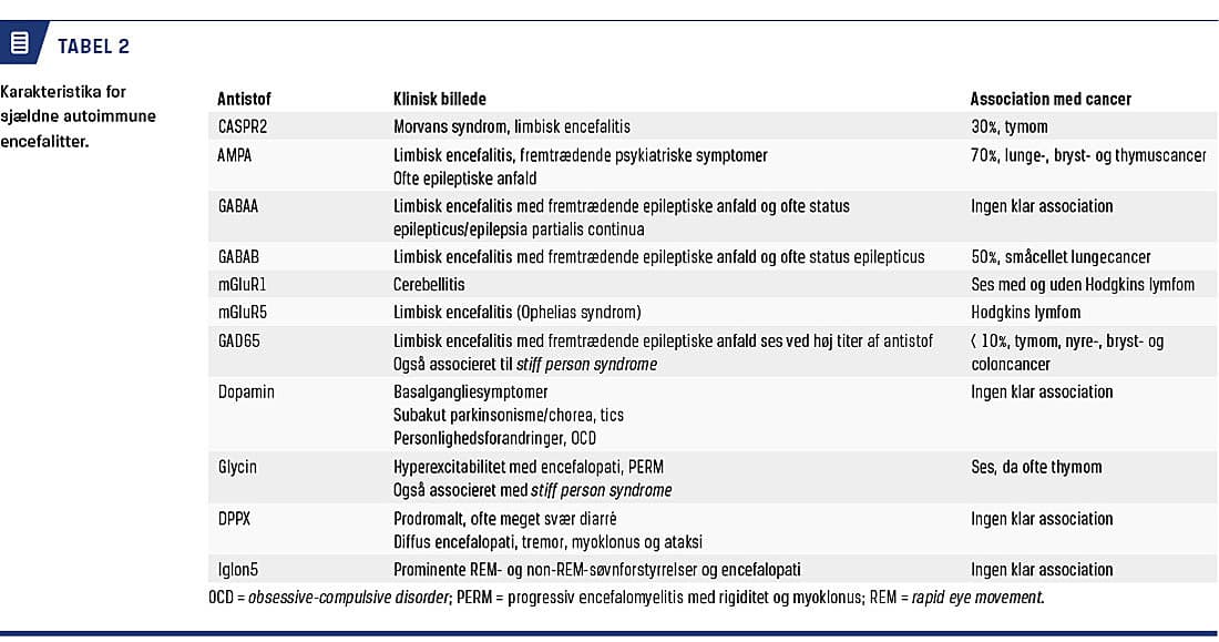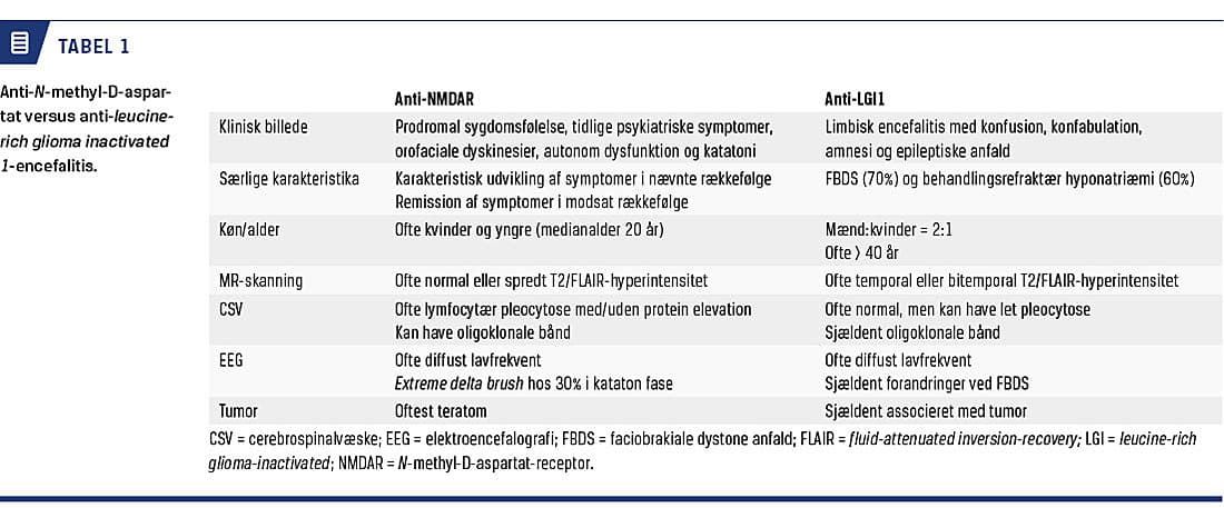NMDAR-encefalitis, påviste man til sammenligning en mortalitet 24 måneder efter diagnosen på 9,5%, og 20% af patienterne havde i efterforløbet betydelige funktionstab (modified Rankin scale > 2) [2]. Tidlig og korrekt diagnostik af AIE (Figur 1) er vigtig, da patienterne oftest responderer godt på immunterapi. Herudover vil AIE i nogle tilfælde være led i et paraneoplastisk syndrom, hvorved diagnosticeringen især bliver vigtig for behandling af den underliggende cancersygdom. Nedenfor gennemgås klinik og paraklinik samt anti-NMDAR- og anti-LGI1-encefalitis (Tabel 1), som p.t. udgør ca. 80% af de diagnosticerede tilfælde af AIE i Danmark. Symptomer og kendetegn for de mere sjældne former for AIE er sammenfattet i Tabel 2.