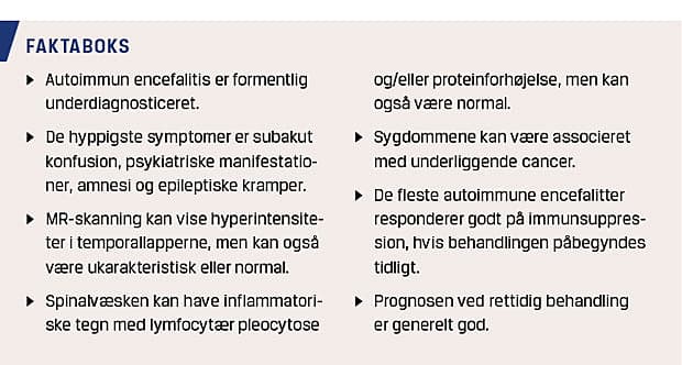 Autoimmun encefalitis (AIE) er en gruppe antistofmedierede sygdomme med neurologiske og psykiatriske symptomer. De giver ofte symptomer, der er forenelige med affektion af limbiske hjernestrukturer (amnesi, konfusion og epileptiske anfald), men kan give andre symptomer, der er karakteristiske for den enkelte sygdom. Modsat de velkendte klassiske paraneoplastiske tilstande (f.eks. anti-Hu-syndrom), hvor antistoffet i sig selv ikke er patologisk, men en markør for en underliggende cancersygdom, er de nye autoimmune encefalitter karakteriseret ved antistoffer rettet mod synaptiske/overfladiske proteiner, f.eks. receptorer for neurotransmittere. Antistofferne medfører oftest en nedregulering af antigenet, og fjernelse af antistoffet vil derfor bedre tilstanden. De hyppigste AIE er forbundet med antistoffer mod glutamatreceptorer af typen N-methyl-D-aspartat (NMDAR) eller mod et protein, der er associeret med den spændingsafhængige kaliumkanal kaldet leucine-rich glioma-inactivated 1 (LGI1) [1]. AIE diagnosticeres i stigende grad i disse år, og i henhold til tal fra Statens Serum Institut blev antistoffer mod NMDAR påvist hos 13 patienter i perioden 2009-2012, men hos 20 patienter i 2013 og 17 i 2014, hvilket svarer til ca. 3,3 tilfælde pr. år pr. million indbyggere. Til sammenligning anslås incidensen af encefalitis, der er forårsaget af herpes simplex virus-type 1 (HSV1) i Sverige, at være 2,2 tilfælde pr. million indbyggere pr. år [2] med en etårsmortalitet på 14%. Hos yngre forekommer anti-NMDAR encefalitis hyppigere end enkelte undertyper af viral encefalitis, og i et større studie påviste man anti-NMDAR-encefalitis hos 32 ud af 761 patienter, der blev undersøgt for encefalitis af ukendt ætiologi [3]. I samme studie var forekomsten af HSV1 kun syv af 761 patienter [3]. I det hidtil største kohortestudie med 577 patienter, der havde anti-