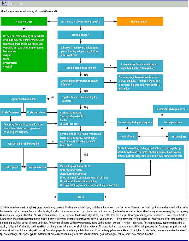Der er over hundrede årsager til kronisk hoste, og ofte er de ekstrapulmonale årsager vanskeligst at diagnosticere. Når der er patologiske forandringer i lungerne, skal man som udgangspunkt antage dem for at være årsagen til den underliggende hoste (Figur 1). De hyppigste pulmonale årsager ud over astma er KOL og bronkiektasier [3]. Begge disse tilstande kræver spirometri og røntgenundersøgelse af thorax, for at man kan komme diagnosen nærmere. Ved manglende bekræftelse kan man videreføre efterforskningen og få taget højopløsningscomputertomografi (HRCT) (dette gælder især ved bronkiektasier og bør kun foretages, hvis anamnesen forstærker mistanken).