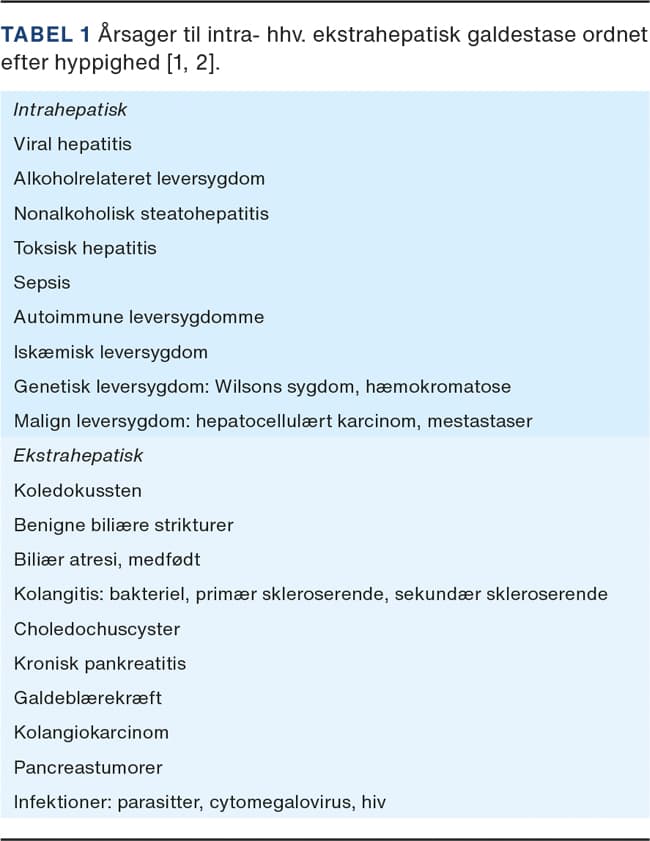 Galdestase, eller kolestase er en relativt hyppig tilstand, som defineres ved, at leverens evne til at udskille galde er nedsat. Årsager til galdestase spænder fra hepatocellulær sygdom til mekanisk ofte ekstrahepatisk obstruktion af galdeafløbet, oftest forårsaget af galdesten, malign sygdom i lever og pancreas, metastaserende sygdom, og også benigne strikturer i galdetræet (Tabel 1). Kolestase leder til ophobning af galde i blodet og hepatocytterne, hvilket har en hepatotoksisk og proinflammatorisk effekt i leveren. Galden består hovedsageligt af galdesyrer og affaldsprodukter, herunder bilirubin, som udskilles via leveren. Hyperbilirubinæmi viser sig klinisk som gulfarvning af hud og sclerae (ikterus), mens ophobning af galdesyrer leder til hudkløe. Endvidere leder nedsat udskillelse af galde til malabsorption af fedt og fedtopløselige vitaminer [3].