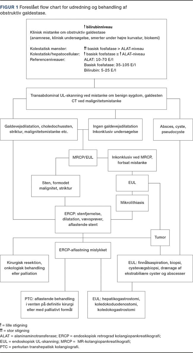 Præsentationen af symptomer ved galdestase er forskellig ved akut og kronisk eller malign sygdom. Hepatocellulær sygdom adskilles fra galdevejssygdom og mekanisk galdestase. Kolikagtige, anfaldsvise smerter under højre kurvatur samt palpationsømhed taler for galdestenssygdom. I forbindelse med infektion må man have formodning om kolecystitis eller mere sjældent, kolangitis. Snigende udvikling af symptomer, palpable processer i leverlejet, med eller uden ømhed og sammen med B-symptomer tyder mere på malignitet. Hyperbilirubinæmi samt forhøjelse af basisk fosfatase- og gamma-glutamyltransferase (GGT)-niveauerne er kendetegnende for biliær dysfunktion. Gulfarvning af hud og sclerae ses først ved et hyperbilirubinæminiveau over ca. 50 µmol/l [6]. Hepatocellulær sygdom kan også manifestere sig med et beskedent kolestatisk mønster i form af let forhøjede niveauer af basisk fosfatase, bilirubin og gamma-GGT samtidig med overvejende forhøjede niveauer af transaminaser. Forhøjede niveauer af bilirubin og basisk fosfatase mere end tre gange referenceværdien sammen med normale eller let forhøjede niveauer af transaminaser taler stærkt for obstruktiv galdestase (Figur 1). Påvirket udskillelse af bilirubin er dog ikke obligat for en tilstand af galdestase, og niveauerne af basisk fosfatase og GGT er mere følsomme som markører for galdestase. Forhøjede niveauer af basisk fosfatase eller bilirubin er heller ikke nødvendigvis leverspecifikke. I tilfælde af diagnostiske vanskeligheder med at identificere årsagen til forhøjet niveau af basisk fosfatase bør der suppleres med gamma-GGT-måling og evt. måling af fraktioneret basisk fosfatase for at indsnævre diagnostikken yderligere. Tumormarkører som f.eks. karcinoembryonalt antigen, cancerantigen (CA)-19-9 og CA125 er ofte forhøjede ved både benign og malign biliær obstruktion og således ikke velegnede til differentialdiagnostik i de tidlige stadier [1, 7-9].