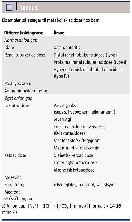 Metabolisk acidose er en hyppig tilstand på en børneafdeling. Der er mange differentialdiagnoser til metabolisk acidose hos børn, men årsagen er ofte oplagt, f.eks. gastroenteritis (pga. tab af HCO3– i afføringen) eller sepsis (pga. laktatophobning) (Tabel 1) [1]. Hvis årsagen er uklar, kan udregning af anion gap