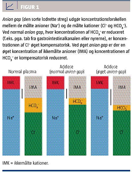 Ved øget anion gap er der en ophobning af ikkepåviste anioner, f.eks. laktat, ketoner (ved diabetisk ketoacidose eller faste), salicylsyre (ved acetylsyreforgiftning) og organiske syrer (ved arvelige stofskiftesygdomme) (Figur 1).