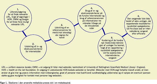 Materiale og metoder: Websider blev fundet ved hjælp af litteratursøgning og søgning i specielt udvalgte kilder på internettet. In- og eksklusionskriterier blev udviklet på basis af litteratur og anvendt på en række potentielt relevante sider. En foreløbig søgestrategi blev udviklet, teknologier blev identificeret, nyhed og relevans af disse blev vurderet af urologer i teamet, og information herfra blev brugt til at justere strategien. Seks urologer testede strategien, og deres fund blev brugt til at opstille rækken af internetsider efter efficiens. Her er efficiens forstået som mindst antal minutter brugt pr. fund af information om en ny væsentlig medicinsk teknologi.