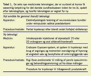 På websiderne blev der fundet informationer om nye data inden for kendte behandlinger, men på seks af de ti websider også om ny viden om syv nye medicinske teknologier. Heraf blev seks af mindst den ene urolog i teamet vurderet som væsentlige for det danske sundhedsvæsen inden for tre år (Tabel 1 ).