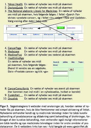 Resultater: Strategien består af ti sider, som bør benyttes i følgende rækkefølge: YahooHealth, DoctorsGuide, The National Electronic Library for Medicines, CancerPage, Medscape, MedlinePlus, HealthAndAge, CancerConsultants, EurekAlert, Oncolink. Links til disse sider findes på www.ugeskriftet.dk