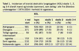 Tabel 1 viser fordelingen af mænd og kvinder (samlet) i forskellige KOL-stadier efter de 25 års opfølgning. Der ses en klar effekt af rygning i form af et bemærkelsesværdigt fald uden signifikant kønsforskel i procentdelen af raske pers oner fra over 90% blandt aldrigrygere til omkring 65% for vedvarende rygere. Det omvendte gør sig gældende for KOL-stadierne med en progressiv stigning i procentdelen af personer med nedsat lungefunktion fra 3% i KOL-stadie 1 for aldrigrygere til 11% for vedvarende rygere; fra 4% i stadie 2 for aldrigrygere til 21% for vedvarende rygere og fra 1% i stadie 3 og 4 for aldrigrygere til 4% for vedvarende rygere.