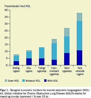 På verdensplan er kronisk obstruktiv lungesygdom (KOL) en af de vigtigste årsager til sygelighed og død, og andelen forventes at stige yderligere [1, 2]. Tobaksrygning er den mest betydningsfulde risikofaktor for udvikling af KOL. Den skadelige virkning af rygning medieres hovedsageligt via et accelereret tab af forceret eksspiratorisk volumen i 1. sekund (FEV1) i voksenalderen og fører over årene til et betydeligt fald i lungefunktion og symptomatisk sygdom. Man har i adskillige studier påvist øget relativ risiko for udvikling af KOL hos rygere sammenlignet med hos ikkerygere [3, 4], men de fleste af disse studier strækker sig kun over relativt kort tid, dvs. 5-10 år, og udvikling af KOL tager normalt flere årtier.