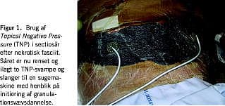 TNP-systemet består af en svamp anbragt i såret, som er dækket af en tynd film, så der ved et sug skabes undertryk (Figur 1 ). Klinisk er effekten en hurtigere dannelse af granulationsvæv og dermed opheling. Den endelige virkningsmekanisme bag denne metode er ikke afklaret, men opsugning og fjernelse af sårekssudat og den deraf følgende nedsættelse af det interstitielle ødem og tryk synes at bedre vævsperfusionen. Indikationen for metoden er alle typer af problemsår, der dog skal være reviderede, så der ikke findes nekroser i sårene. Kontraindikationerne synes at være få og er ikke endeligt fastlagt. Fremtidige studier må fastlægge den endelige effekt af metoden.