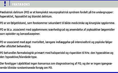 Akut cerebral dysfunktion defineret som delirium er et komplekst neuropsykiatrisk syndrom, som ofte ses sekundært til anden sygdom og forekommer hos såvel medicinske som kirurgiske patienter. Delirium hos voksne er en meget hyppig komplikation i forbindelse med alvorlig sygdom med en prævalens på 10-30% af patienterne på almene sengeafsnit stigende til 50-80% på et intensivafsnit [1, 2]. Prævalensen af pædiatrisk delirium (PD) er behæftet med en del usikkerhed, men er blandt andet angivet til at ligge på 4-13% [3-5].