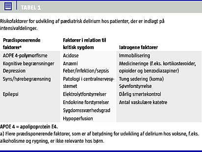 Årsagerne til PD hos det kritisk syge barn er formentlig multifaktorielle, og der er adskillige risikofaktorer forbundet med udvikling af PD. Disse risikofaktorer kan opdeles i tre grupper: 1) prædisponerende, 2) aktuelle, som inkluderer sygdomstype og sværhedsgrad, og 3) iatrogene, som finder sted på en intensivafdeling (ITA) [4] (se Tabel 1 ). Dog er vores aktuelle viden i høj grad overført fra studier med voksne. Flere af de prædisponerende faktorer for voksne er således ikke relevante for børn. Polymorfisme af apolipoprotein E4, som tidligere er blevet forbundet med udvikling af Alzheimers sygdom og dårligere udfald ved hovedskader og intrakraniel blødning, er for nylig blevet associeret med udvikling af delirium hos voksne [4] og kan potentielt være en prædisponerende faktor til udvikling af PD. Af de kendte risikofaktorer er særligt sygdommens sværhedsgrad af betydning for udvikling af delirium hos kritisk syge børn og voksne [12, 27]. Dette fænomen er formentlig multifaktorielt, men det er nærliggende at antage, at sygdommens sværhedsgrad blandt kritisk syge børn er nært forbundet med hyppigheden af invasive procedurer som f.eks. kanylering og respiratorbehandling, som ofte kræver en vis sedering af patienten.