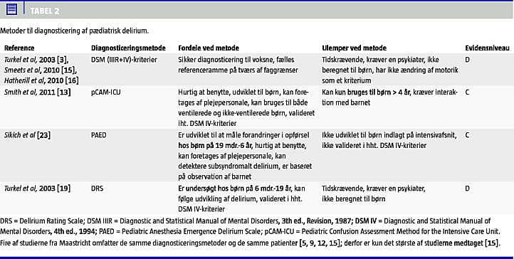 Delirium hos kritiske syge patienter er en alvorlig klinisk tilstand, som er associeret med øget morbiditet, forlænget indlæggelse på hospitalet, højere mortalitet under indlæggelsen samt nedsat livskvalitet efter endt behandling for såvel patienter som pårørende. Op til 80% af de kritisk syge voksne vurderes at have delirium [2]. Pædiatrisk delirium (PD) hos kritisk syge børn er meget sparsomt beskrevet og undersøgt på trods af den udbredte opfattelse, at børn har større risiko for at få delirium, end voksne har [6, 34]. De voksne patienters meget høje prævalens genfindes ikke i den eksisterende litteratur om PD, hvilket formentligt er et udtryk for, at PD er en underdiagnosticeret og overset tilstand blandt kritisk syge børn. Særligt den hypoaktive type erkendes måske slet ikke, fordi barnet ikke på samme måde som ved den hyperaktive type er i risiko for autoekstubation, seponering af kat etre eller lignende akutte, livstruende handlinger. Tilstanden er forbundet med megen kompleksitet og fluktuation hos det kritisk syge barn, og der savnes validerede og letanvendelige diagnosticeringsmetoder, som er specifikt tilpasset kritisk syge børn på intensivafsnit. P.t. er der ingen konsensus om diagnosticering af PD. DSM-kriterierne blev udviklet til diagnosticering af delirium hos voksne, men benyttes også hos børn. Kriterierne har dog en række begrænsninger, eftersom de ikke er beregnet til sporing af motoriske ændringer, som ellers er essentielt for PD. Endvidere er det en tids- og personalekrævende undersøgelse. Til trods for udvikling af flere screeningsmetoder, som er både hurtige i brug og kan foretages af plejepersonalet, til udredning af delirium hos voksne har det været problematisk at overføre disse screeningsmetoder til screening af børn. Efter at disse screeningsredskaber er blevet udbredt på intensivafdelingerne, er der kommet mere fokus på at forebygge, opdage og behandle delirium [4]. Vi kender endnu ikke de kliniske resultater af denne indsats. Ydermere har den kliniske betydning af PD været uklar. Først inden for de seneste år er der begyndt at dukke videnskabelig litteratur op om børn og delirium, men materialet er endnu sparsomt, og kvaliteten er evidensgrad C og D. Dette er en klar begrænsning i denne litteraturgennemgang. De nuværende artikler, som beskæftiger sig specifikt med PD, er pga. forskelligt design og set-up vanskelige at sammenligne og begrænser mulighederne for at udarbejde evidensbaserede rekommandationer om emnet. Til trods for vores begrænsede viden om PD, er konsekvenserne af delirium hos kritisk syge voksne så entydigt negative, at vi, indtil det modsatte er bevist, må betragte PD som en skadelig følgetilstand til alvorlig sygdom. Ingen veldesignede, randomiserede, kliniske forsøg vedrørende PD er efter vores vidende hidtil foretaget eller under udarbejdelse.