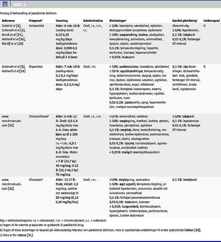 Haloperidoldoseringen er baseret på empiri og foregår ved gradvis titrering, indtil den rette balance mellem klinisk respons og uønskede bivirkninger er nået [11, 30]. Risperidon, som er et andengenera- tionsantipsykotikum, virker mindre blokerende på dopaminreceptorerne end haloperidol og har en bedre effekt på de negative symptomer, som primært er fremherskende ved hypoaktivt og blandet PD [5, 12, 16, 31]. Haloperidol givet intravenøst anbefales til hyperaktivt PD med en loading -dosis på 0,15-0,25 mg/kg/døgn og en vedligeholdelsesdosis på 0,009-0,5 mg/kg/døgn. Risperidon givet enteralt administreret anbefales til det hypoaktive og blandede PD med en loading -dosis på 0,1-0,2 mg/kg/døgn og en vedligeholdelsesdosis på 0,2-2,0 mg/kg/døgn. Risikoen for, at der opstår ekstrapyramidale bivirkninger og det meget sjældne maligne neuroleptikasyndrom, synes at være større ved brug af haloperidol end ved brug af risperidon. Der er således publiceret flere rapporter om, at haloperidolbehandling er associeret med akut dystoni og akatisi ved behandling af PD [5, 25], hvorimod der endnu ikke er rapporteret om lignende bivirkninger ved risperidon. I Tabel 3 angives der forslag til behandlingen af PD baseret på de foreliggende studier [3, 5, 16, 20, 21] og Mercks pædiatriske rekommandationer [33].