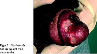 En 40-årig mand fik ømme sår på penis ti dage efter samleje med kvinde i Marokko. Undersøgelser for syfilis, hiv, chlamydia og gonore var alle negative. Patienten blev sat i behandling med dicloxacillin på mistanke om bakteriel infektion. En uge senere havde han fortsat smertefulde sår på penis, rødme og hævelse af den omkringliggende hud (Figur 1 ) og hævelse af de regionale lymfeknuder. Der blev der podet fra sårene. H. ducreyi blev påvist ved specifik polymerasekædereaktions (PCR)-undersøgelse af podepinden [2]. Ved efterfølgende DNA-sekventering af bakterielt 16S rRNA-gen i prøven fandtes sekvenser, der var identiske med sekvenserne ved H. ducreyi [3]. Patienten blev behandlet med intramuskulær injektion af 250 mg ceftriaxon som engangsdosis, og en uge senere var sårene under opheling.