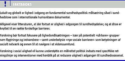Lokalt og globalt er lighed i adgang en fundamental sundhedspolitisk målsætning. Imidlertid viser litteraturen, at der forsat er ulighed i adgangen til sundhedsydelser, og at uligheden er knyttet til en række forskellige barrierer. Forskning bør derfor forsat fokusere på lighedsmålsætningen. Det er her relevant, at man i højere grad anvender en helhedsbetragtning, hvor man eksempelvis i relation til bestemte sygdomskategorier undersøger både diagnostik, behandling, rehabilitering samt overlevelse. Desuden vil det være relevant at fokusere mere på nye potentielt »sårbare« grupper som flygtninge og indvandrere samt underbelyste »nye sociale barrierer" som f.eks. arbejdsmarkedstilknytning, evnen til at navigere i et videnssamfund og betydningen af socialt netværk. En sådan forskning vil kunne understøtte en målrettet politisk indsats med specifikke retningslinjer og interventioner med henblik på at reducere uligheden i adgangen til sundhedsvæsenet i Danmark.