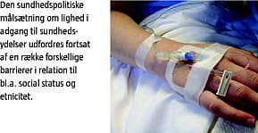 Summary Lack of equity in access to healthcare Ugeskr Læger 2010;172(10):782-784 Equity in access is seen when needs determine access irrespective of population characteristics such as socioeconomic status and ethnicity. Equity in access is often investigated using indirect measures like utilisation as an equity proxy; however, disease stage and survival constitute alternative measures. Despite that equity in access to healthcare is a local and global political objective, inequities in access are still widespread even e.g. in Danish healthcare where equal and easy access are express political goals.