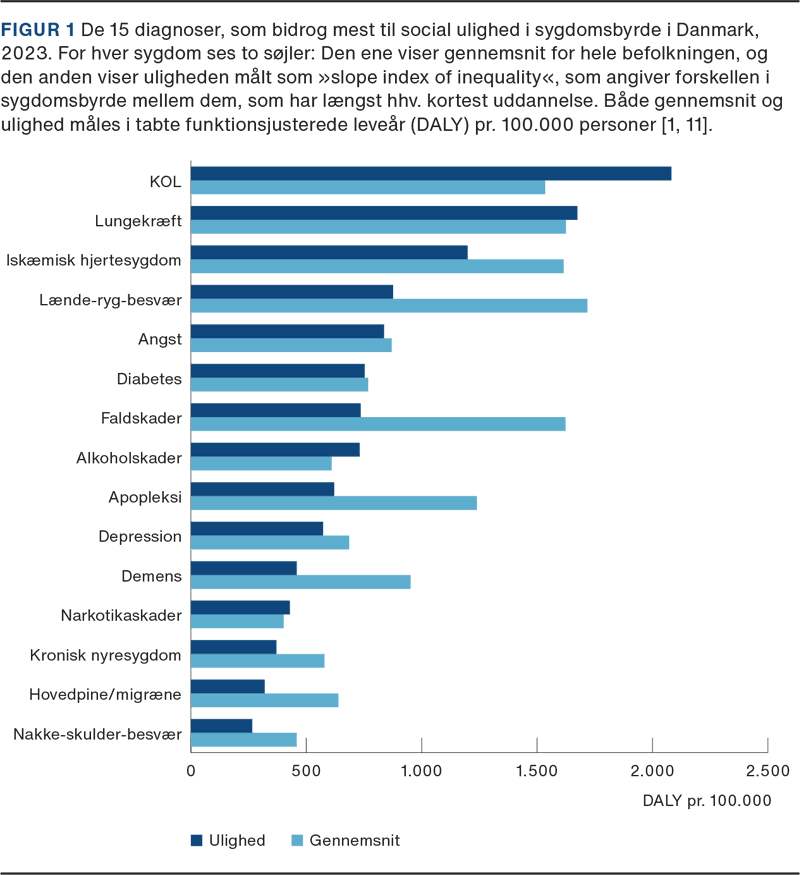 Det sociale mønster i form af en social gradient i incidens findes i Danmark for ca. tre fjerdedele af de 750 diagnoser, som er undersøgt [10]. De 15 diagnoser, som bidrager mest til den sociale ulighed i sygdomsbyrde, er illustreret i Figur 1. Figuren viser sygdomsbyrden i termer som tabte leveår, for tidlig død og grader af nedsat funktionsevne – betegnet disability-adjusted life year (DALY) eller på dansk: tabte funktionsjusterede leveår [11]. For hver sygdom vises sygdomsbyrden i gennemsnit for hele befolkningen, og uligheden er målt som forskel i sygdomsbyrde mellem personer med længst hhv. kortest uddannelse [1]. At mange sygdomme har samme sociale mønster, medfører en udtalt social ulighed i forekomsten af flere samtidige diagnoser – såkaldt multisygdom [12].