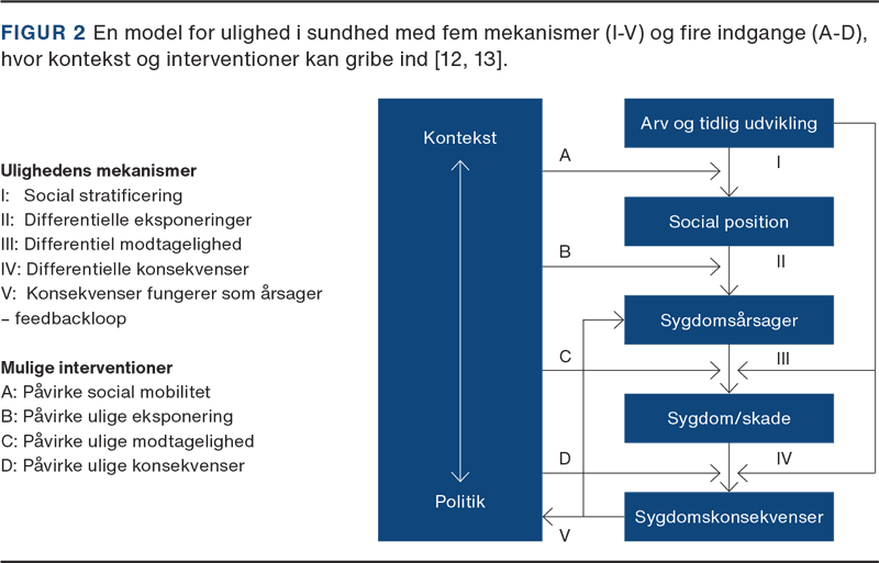 For at forstå, hvordan uligheden opstår, og hvad der kan gøres for at reducere den, kan man have hjælp af en model, som illustrerer de aktuelle mekanismer. Figur 2 viser en sådan model med fem mekanismer (I-V) og fire indgange (A-D) for mulige indsatser [13]. Modellen kan også bruges til at strukturere de spørgsmål, som skal besvares for at forstå og reducere uligheden [14].
